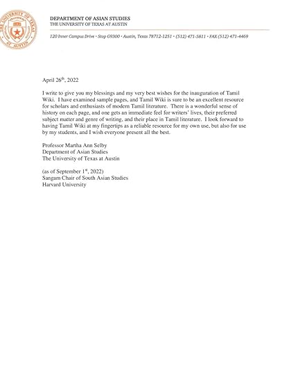 தமிழ் விக்கி பற்றி வந்த வாழ்த்துரைகளில் பேரா மார்த்தா ஆன் செல்பியின் வாழ்த்து மிக முக்கியமானது. அவருக்கு எங்கள் கலைக்களஞ்சியத்தின் இணைப்பை முன்னரே அனுப்பியிருந்தோம். அவர் அவற்றிலுள்ள பதிவுகளை பார்த்துவிட்டு நிறைவுற்று இதை அனுப்பியிருந்தார். முறைமைகள் பேணப்படும் ஒரு பெரிய கல்விநிறுவனத்தின் ஏற்பு இது. டெக்சாஸ் பல்கலையின் ஆசியவியல் துறையின் தலைவியான மார்த்தா விரைவில் ஹார்வார்ட் பல்கலையின் சங்க இலக்கிய இருக்கையின் தலைவியாக பொறுப்பேற்கவிருக்கிறார்.