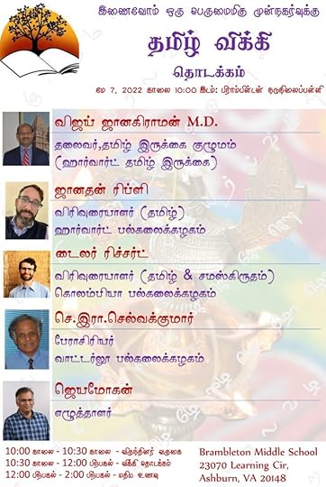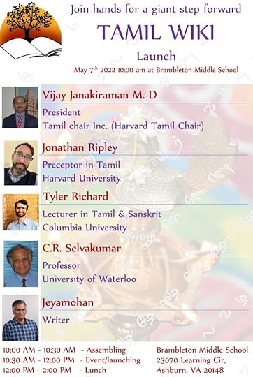 வரும் மே 7 அன்று அமெரிக்காவில் ஆஷ்பர்ன் பிராம்பிள்டன் நடுநிலைப்பள்ளி வளாகத்தில் விஷ்ணுபுரம் இலக்கியவட்டம் சார்பில் உருவாக்கப்பட்டு வரும் தமிழ் விக்கி என்னும் இணையக் கலைக்களஞ்சியத்தின் தொடக்கவிழா நிகழ்கிறது. ஹார்வார்ட், கொலம்பியா, வாட்டர்லூ பல்கலைக் கழக பேராசிரியர்கள் கலந்துகொள்ளும் விழா. நண்பர்கள் அமைப்பாளர்களை தொடர்பு கொண்டு அழைப்பிதழ்களைப் பெற்றுக்கொண்டு வருகைதரவேண்டும் என கோருகிறேன்.
