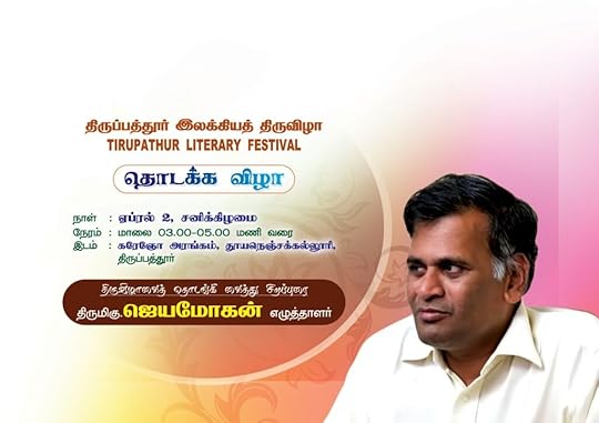 திருப்பத்தூர் தூய நெஞ்சக் கல்லூரியில் நிகழ இருக்கும் விழாவை தொடங்கி வைக்க 2-ந்தேதி தாங்கள் வருவது மகிழ்ச்சியளிக்கிறது. தீவிர தமிழ் இலக்கியத்தில் அவ்வளவாக பதிவாகாத நிலம் தமிழக வட எல்லை மாவட்டங்கள் என்று மிகச் சரியாக தாங்கள் வேறு பொதுவான விஷயங்களைப் பற்றி பேசிச் செல்லும் போது குறிப்பிட்டிருப்பீர்கள்.