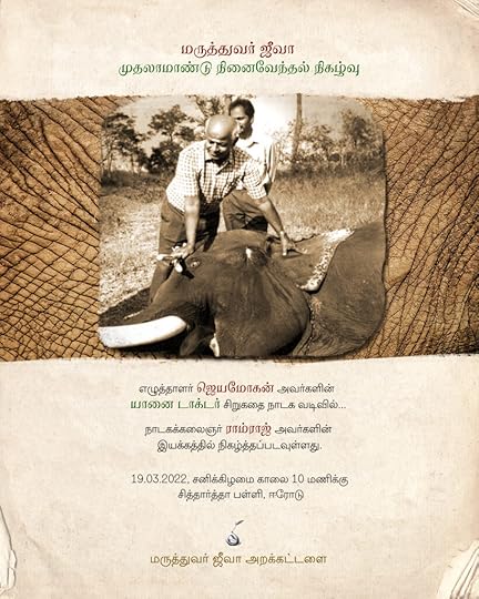 காந்தியக்கம்யூனிஸ்ட்டாக தனது வாழ்நாள் இறுதிவரை சேவைசார்ந்த வைராக்கியத்தோடு செயலாற்றிய பேராளுமை மருத்துவர் ஜீவா அவர்களின் முதலாமாண்டு நினைவேந்தல் நிகழ்வு ஈரோட்டில் நிகழவுள்ளது. வருகிற 19.03.2022 அன்று சித்தார்த்தா பள்ளியில் நிகழும் இந்த நினைவேந்தல் கூடுகையில், உங்களுடைய ‘யானை டாக்டர்’ சிறுகதையானது நாடகவடிவில் நிகழ்த்தப்படுகிறது. நாடகக்கலைஞர் ராம்ராஜின் இயக்கத்தில் அவருடைய நாடகக்குழு மாணவர்களால் இந்த நிகழ்த்துவடிவம் நிகழ்கிறது.