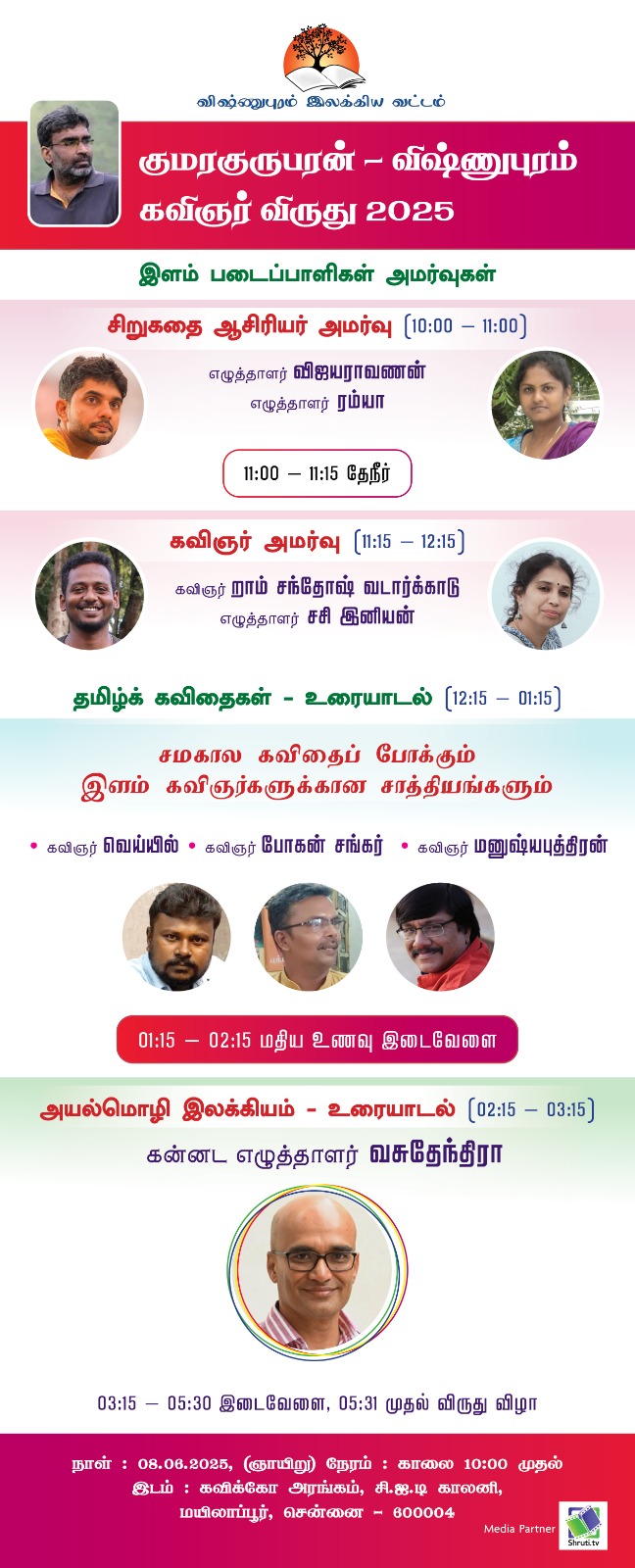 சிறப்பு விருந்தினராக கன்னட -ஆங்கில எழுத்தாளர் வசுதேந்திரா கலந்துகொள்கிறார். நிகழ்வில் கவிஞர் போகன் சங்கர், கவிஞர் விஜயலட்சுமி ஆகியோர் பங்கெடுக்கிறார்கள்.