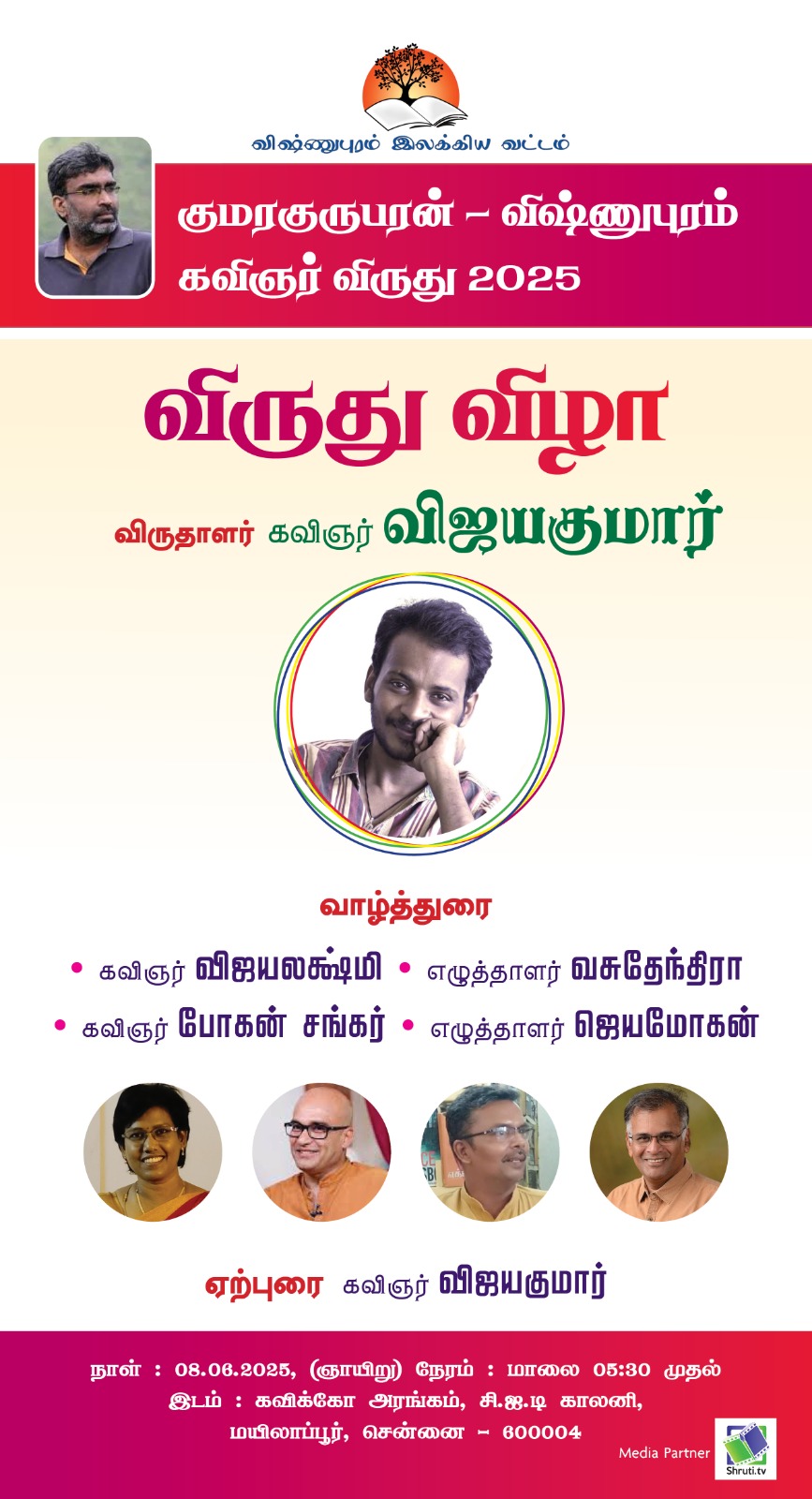 கவிஞர் சோ. விஜயகுமார் இந்த ஆண்டுக்கான குமரகுருபரன் – விஷ்ணுபுரம் விருதை பெறுகிறார். விருதுவிழா வரும் 8 ஜூன் 2025 அன்று சென்னை கவிக்கோ அரங்கில் நிகழ்கிறது.