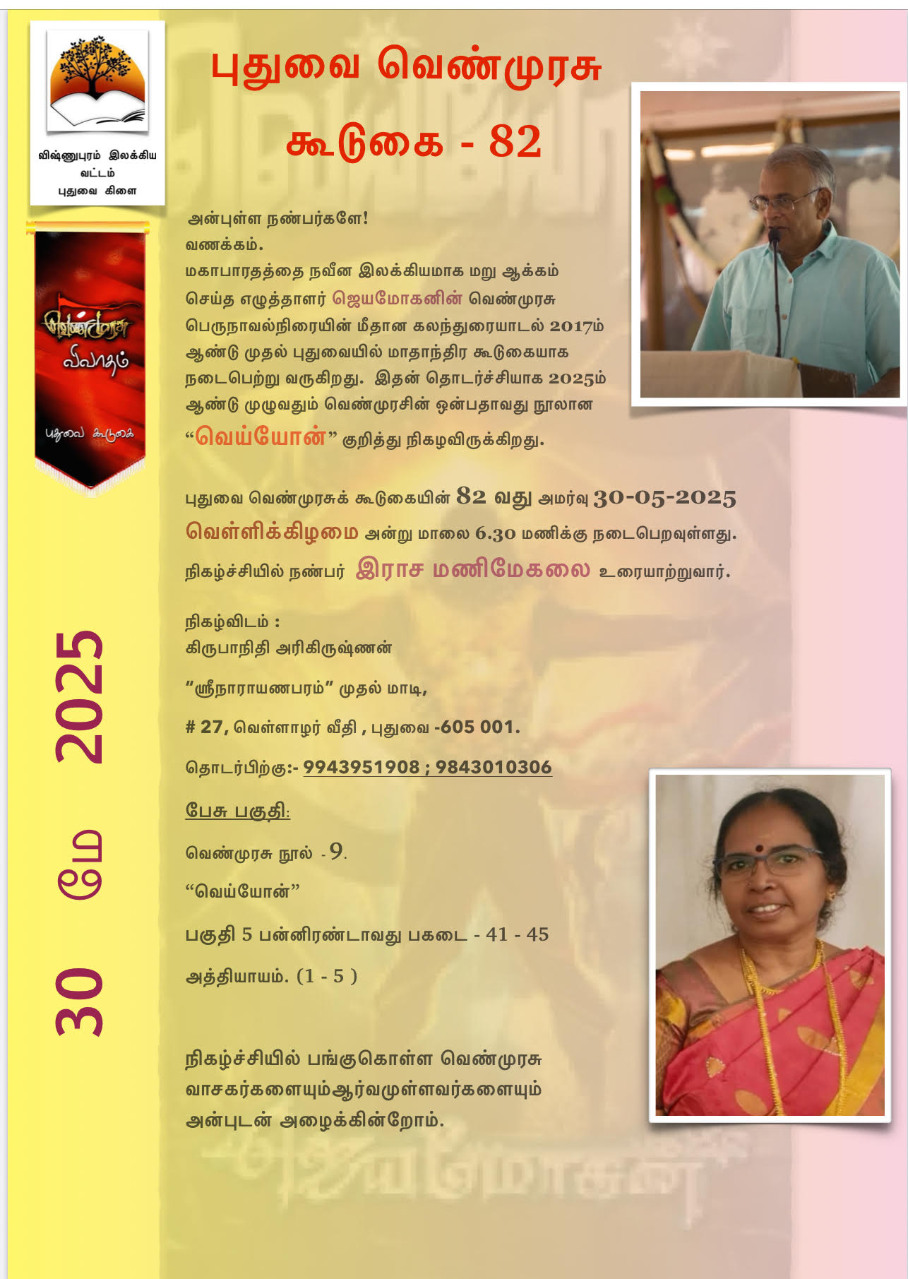 புதுவை வெண்முரசுக் கூடுகையின் 82 வது அமர்வு 30-05-2025 வெள்ளிக்கிழமை அன்று மாலை 6.30 மணிக்கு நடைபெறவுள்ளது.