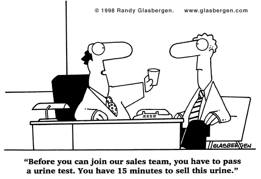 ”எங்க கம்பெனியிலே சேல்ஸ்மேனா ஆகிறதுக்கு முன்னாடி நீங்க யூரின் டெஸ்ட் குடுக்கணும். போயி பதினஞ்சு நிமிசத்திலே இந்த யூரினை வித்து காட்டுங்க”