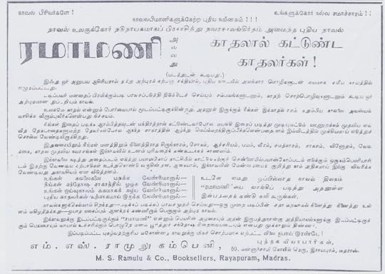 மேலே சொன்ன ரமாமணி புத்தக விளம்பரத்தின் முன்னோடியாக சில விளம்பரங்களைச் சொல்லலாம். இப்போதுகூட இந்த விளம்பரத்தின் பாணியில் நம் நாவல்களை விளம்பரம் செய்யலாம். “உங்கள் பார்வை சமூக யதார்த்தங்களை ஊடுருவட்டும்! எக்ஸ்ரே கண்களை அடைய வாசியுங்கள் செஞ்சோற்று செந்தோழர் எழுதிய ரத்தப்பூக்கள்!”