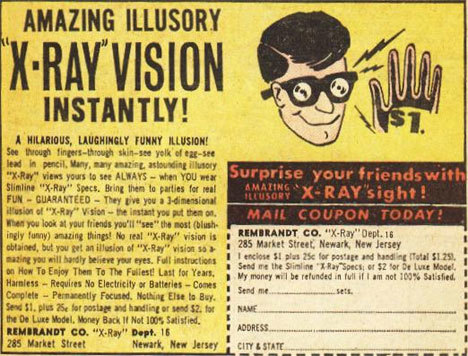 மேற்கண்ட எக்ஸ்ரே கண்ணாடி மிகப்பெரிய வியாபாரமாக இருந்திருக்கிறது. தொடர்ச்சியாக நிறைய விளம்பரங்கள் கண்ணுக்கு தட்டுப்பட்டுக்கொண்டெ இருக்கின்றன.ஆனால் எதிர்ப்படுபவர்களை எலும்புக்கூடுகளாகப் பார்ப்பதில் என்ன இன்பம் என்று தெரியவில்லை. எலும்புக்கூடுகளை தசைகளுடன் பார்க்கும் கண்ணாடி இருந்தாலாவது திரிஷாவையெல்லாம் ரசிக்கமுயலமுடியும். ஆனால் ஒன்று, எக்ஸ்ரேயில் எல்லாரும் சிரித்த முகமாக இருப்பார்கள்.