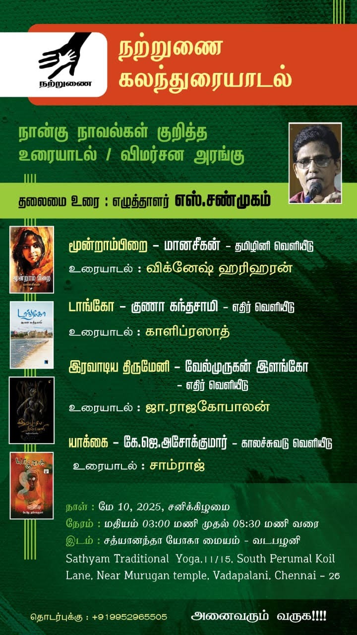 அடுத்த நற்றுணை கலந்துரையாடல் கூட்டம் வரும் சனிக்கிழமை 10-05-2025 அன்று மாலை 03:00 மணி்க்கு துவங்குகிறது. சமீபத்திய நான்கு நாவல்கள் குறித்த உரையாடல் / விமர்சன அரங்காக இது நிகழ்கிறது. விவரங்கள் இங்கே