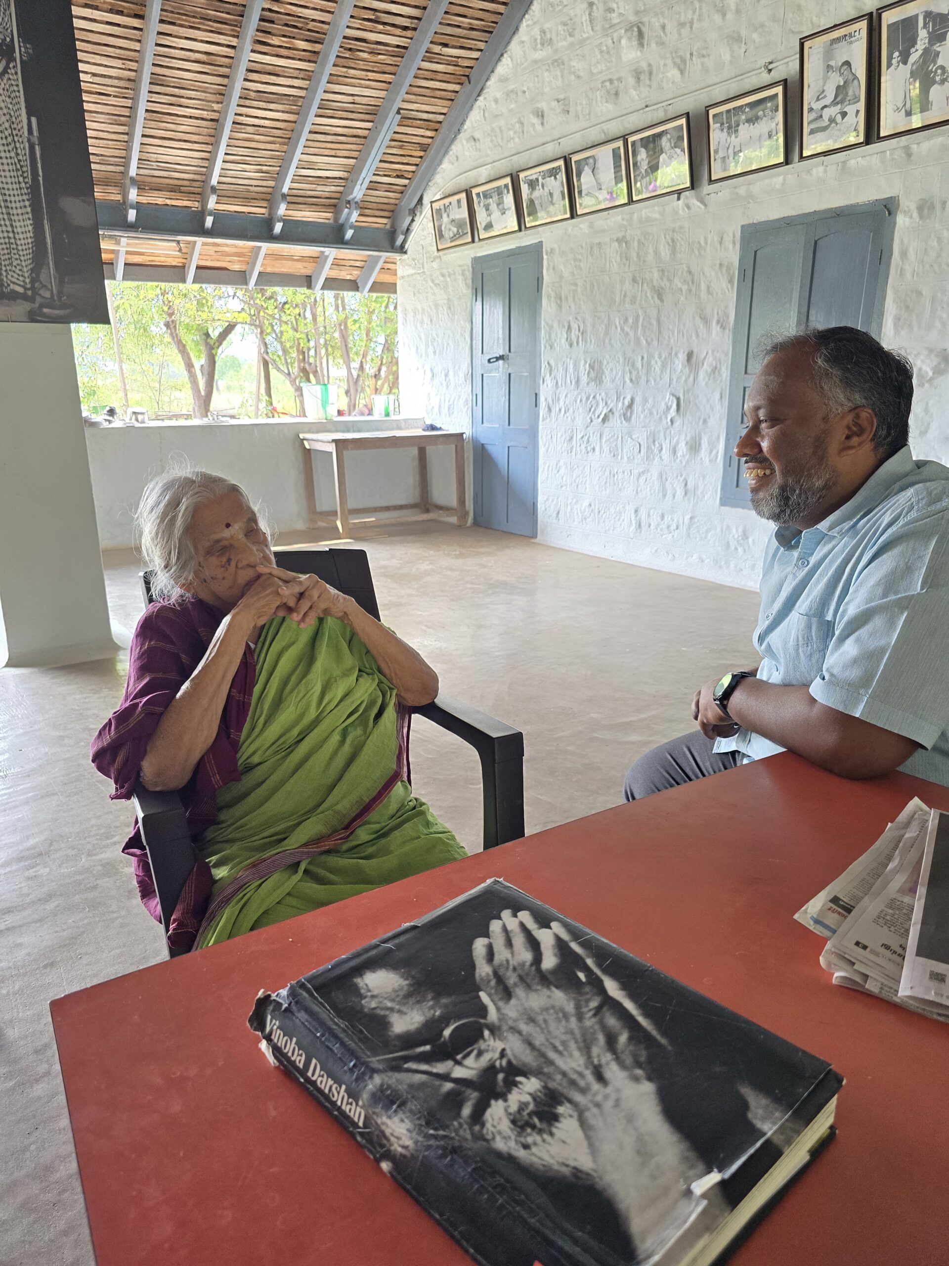 அதற்குள் அவர்களின் மகள் மருத்துவர் சத்யாக்கா, வந்தார்கள், எங்களை வரவேற்று டீ சாப்பிடுங்கள் என்று அன்புக்கட்டளையோடு உள்ளே சென்றார்கள். அம்மா, வினோபா பவே பற்றியும், தன் இளம் பருவத்தில் குழந்தைகளை பள்ளியில் விட்டு விட்டு போராட்டங்களுக்கு சென்றதை பற்றி சொன்னார்கள். அவர் மகன் பூமியின் படிப்பு, சத்யாக்காவின் படிப்பு ஆகியவற்றை பற்றி சொல்லிக்கொண்டிருக்கும் பொழுது மீண்டும் கீழ் வெண்மணி சம்பவம், அதில் பாதிக்கப்பட்ட பெண்களின் முன்னேற்றத்திற்கு இன்று வரை செய்து கொண்டிருக்கும் உதவிகள் பற்றி சொன்னார்கள்.