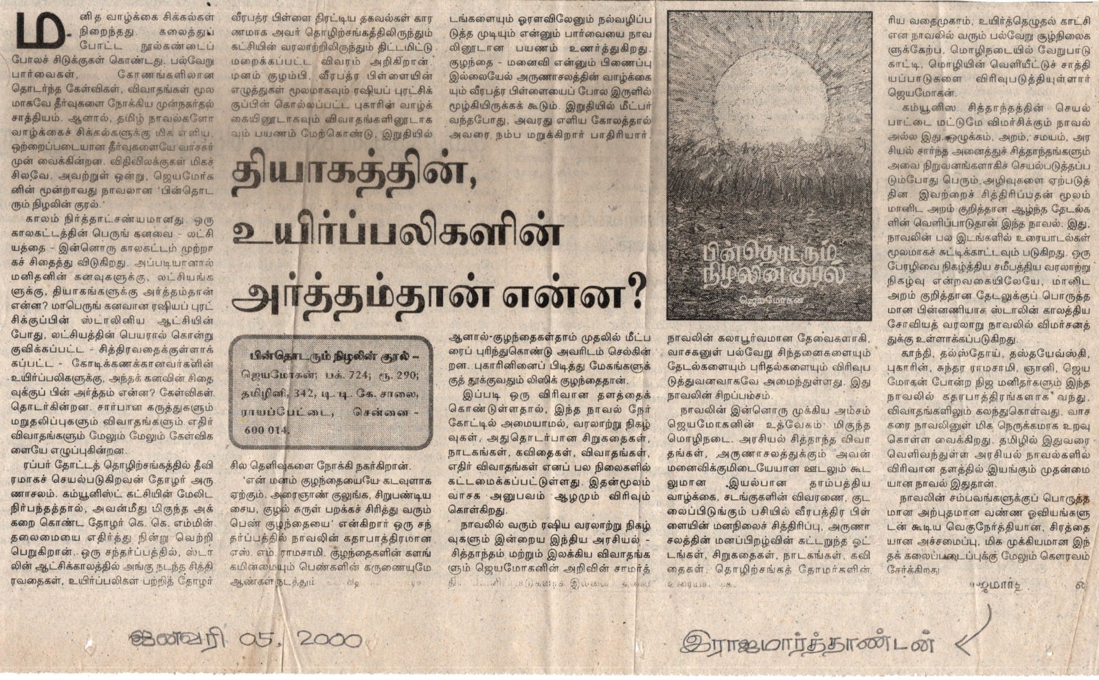 “எந்த ஒரு துப்பும் இது வரை கிடைக்கவில்லை. தலையில் அடிபட்டு இறந்திருக்கிறார். குடித்திருந்ததற்கான சான்று இருக்கிறது. மல்லாந்து விழுந்து பாறாங்கல்லில் அடிபட்டுக்கூட இறந்திருக்கலாம்… இப்போதைக்கு கொலை என்று எங்கள் ஆவணங்களில் இல்லை. சந்தேக மரணம் என்றுதான் இருக்கிறது. விபத்துதான் என்று எழுதினால் கோப்பை மூடிவிடலாம்.”