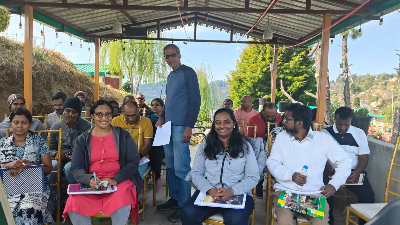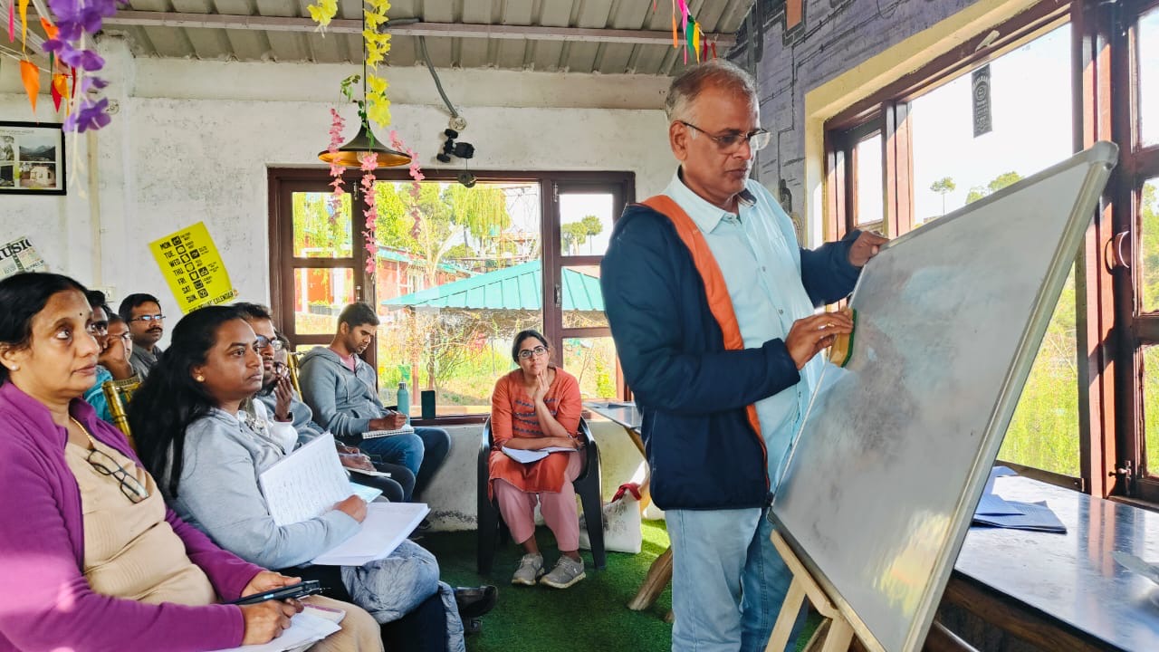 உள்ளறை வகுப்புநந்ததேவி மலையடுக்குகள் தெரியும் என்றார்களே, எங்கே என்று கேட்கலாம் என எண்ணினேன். அதற்குள் நிறுவன நிர்வாகியான துருவ் “நந்ததேவி தெரியும், ஆனால் இன்று முகில் மூடியிருக்கிறது…முகில் விலகினால் தெரியும்” என்றார். கண்களில் நீர்வழிய பார்த்துக்கொண்டிருந்தேன். முகில் கொஞ்சம் விலகியபோது பனிமுடிகளின் மங்கலான வெண்வடிவம் துலங்கி வந்தது. அதைப் பார்த்ததுமே அவ்விடம் மனதுக்கு உகந்தந்தாக ஆகியது.