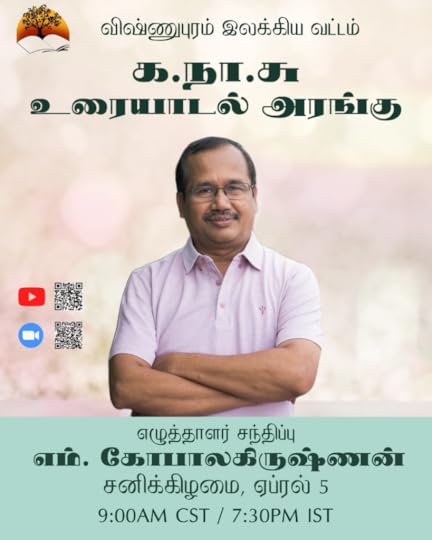 வருகின்ற சனிக்கிழமை (ஏப்ரல் 5, 2025) இணையவழி அரங்கிற்கு, திருப்பூரை, அதன் சுற்றுவட்டாரத்தை, நெசுவுத் தொழிலை தனது யதார்த்தவாத புனைவுகளின் வழியாக பதிவு செய்து வாசகர்களுக்கு வாழ்க்கையை மாயம் எதுவும் இல்லை நிஜம்தான் எனக் காட்டும், எழுத்தாளர் எம். கோபாலகிருஷ்ணன் அவர்களை விருந்தினராக அழைத்துள்ளோம். நாங்கள் அவரை அணுகி தேதி குறித்துப் பேசி இரு மாதங்கள் இருக்கும். நண்பர்கள், கிண்டிலிலும், இந்தியா சென்று திரும்பிய நண்பர்களிடம் சொல்லி அனுப்பி என ஆசிரியரின் நூல்களை வாங்கி வாசித்து, சக நண்பர்களுக்கு அவரவரது அவதானிப்புகளை குறிப்புகள் எழுதி விவாதித்து தயார் நிலையில் உள்ளார்கள். எம். கோபாலகிருஷ்ணன் படைப்புகளை வாசிப்பின் வழியாக அறிமுகம் ஆன அளவிற்கு அவரை நேரில் சந்தித்து அளவளாவியது குறைவு என்பதால், நண்பர்கள் மிக்க ஆர்வமுடன் அவரை சந்திக்க காத்திருக்கிறார்கள். தங்களையும், உலகம் முழுக்க விரவியிருக்கும் வாசக நண்பர்களையும் வந்திருந்து சிறப்பிக்க வேண்டுகிறோம்.