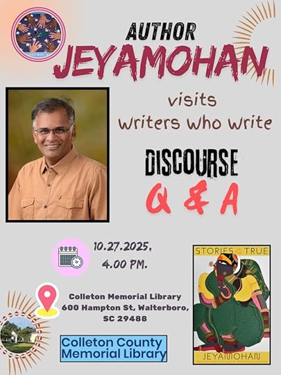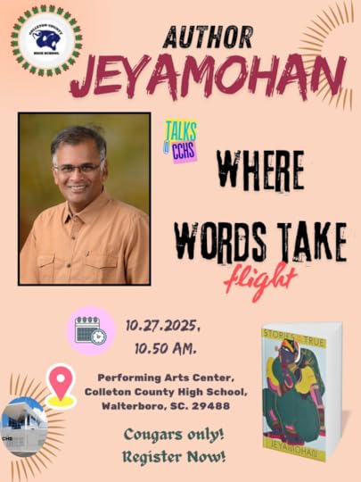 அக்டோபர் 27, திங்களன்று காலை 11 மணிக்கு நீங்கள் கால்ட்டன் கவுண்டி உயர்நிலைப்பள்ளி மாணவர்களிடையே உரையாடுகிறீர்கள். ஆங்கிலத்துறை ஆசிரியர் முனைவர் ஏஞ்சல் டக்கருடன் உங்கள் கதைகள் குறித்தும், இலக்கியப் புனைவுகளை வாசித்தல், புனைவெழுத்தின் நுட்பங்கள் குறித்தும் உரையாடல்; மாணவர்கள் உங்கள் கதைகளைக் குறித்து பேசுவர்; பின் கேள்வி நேரமும் உண்டு.