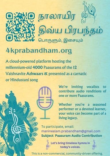 அதிலிருந்து நாம் ஆழ்வார்களை வாசித்தால் என்ன என்று ஆர்வம் எழுந்தது அப்படி ஆரம்பிக்கப்பட்டதுதான் மணிநீலம் பிரபந்தம் என்ற குழுமம். அதிலிருப்பது இந்திய, அமெரிக்க விஷ்ணுபுரம் நண்பர்கள்தான். அந்த அமர்வுகளில் நானும் பார்கவி, மற்றும் சில நண்பர்கள் சில பாடல்களைப் பாடுவதுண்டு. ஜாஜா சொல்வார், “வாசித்துக் கேட்பதை விட பாடிக் கேட்கும்போது அப்பாடலின் பொருள் உடனே நம்மை வந்தடைகிறது“, என்று. அதைக் கேட்டு என் கணவருக்கு நாலாயிரம் பாடல்களையும் கர்நாடக அல்லது இந்துஸ்தானியில் பாடல்களைப் பாடி வெளியிடும் முயற்சி செய்தால் என்ன என்று ஆரம்பித்ததுதான் இது. ஜாஜாவும் நண்பர்களும் உற்சாகம் அளித்தனர்.