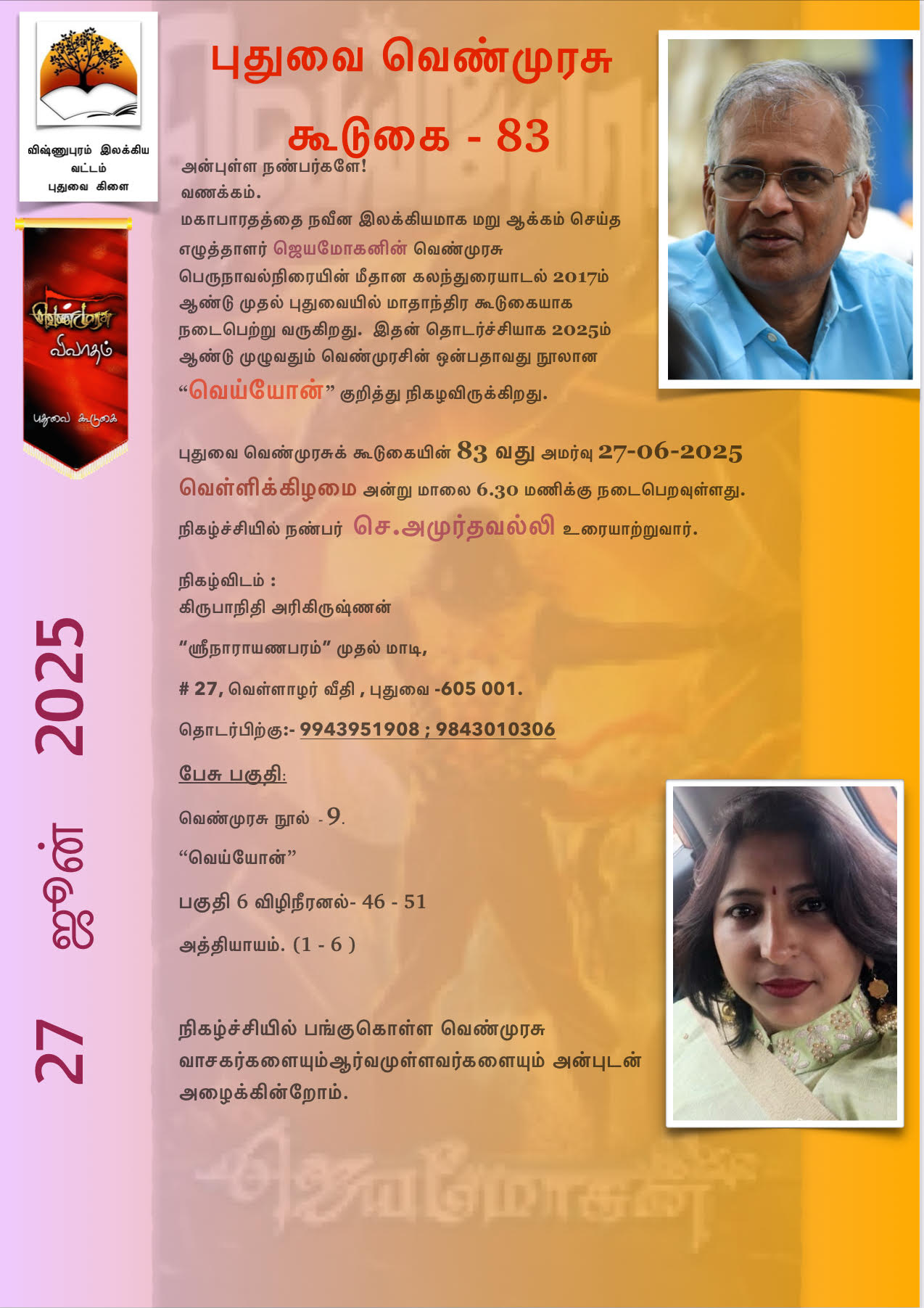 புதுவை வெண்முரசுக் கூடுகையின் 83 வது அமர்வு 27-06-2025 வெள்ளிக்கிழமை அன்று மாலை 6.30 மணிக்கு நடைபெறவுள்ளது. நிகழ்ச்சியில் நண்பர் செ.அமுர்தவல்லி உரையாற்றுவார்.