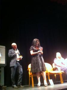 Propelled to my feet by Zoe (who was sitting next to me) I staggered towards the microphone shaking like a leaf. There was some concern that I might fall off the stage – Dave suggested I might want to sit back down! But no, I took that microphone, mumbled incoherent thanks, said something about how my book was like my baby and the award was like my child graduating from university with honours and getting a great job. Not my most impressive moment.