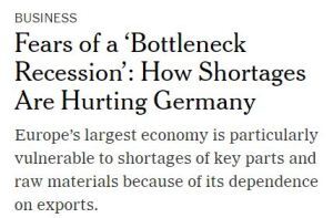The New York Times headline warned of fears of a bottleneck recession in Germany. Other headlines in the Wall Street Journal, the Financial Times, and elsewhere noted the impacts of production and distribution bottlenecks on specific industries.