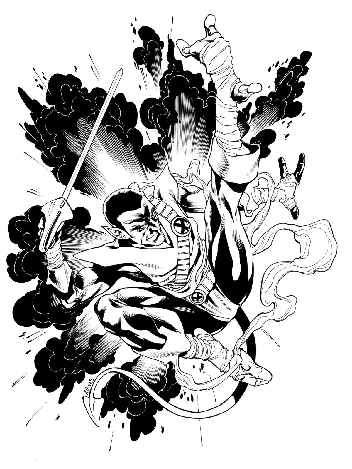 Often when I do sketches I use it as an opportunity to try new techniques in inking. New textures, effects, or rendering methods. Here I happened across a new way to indicate black smoke from an Art Adams sketch I had seen and loved that look for Nightcrawler's Bamf effect. It's a bit time consuming, but a fun effect as black and white art.