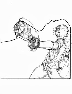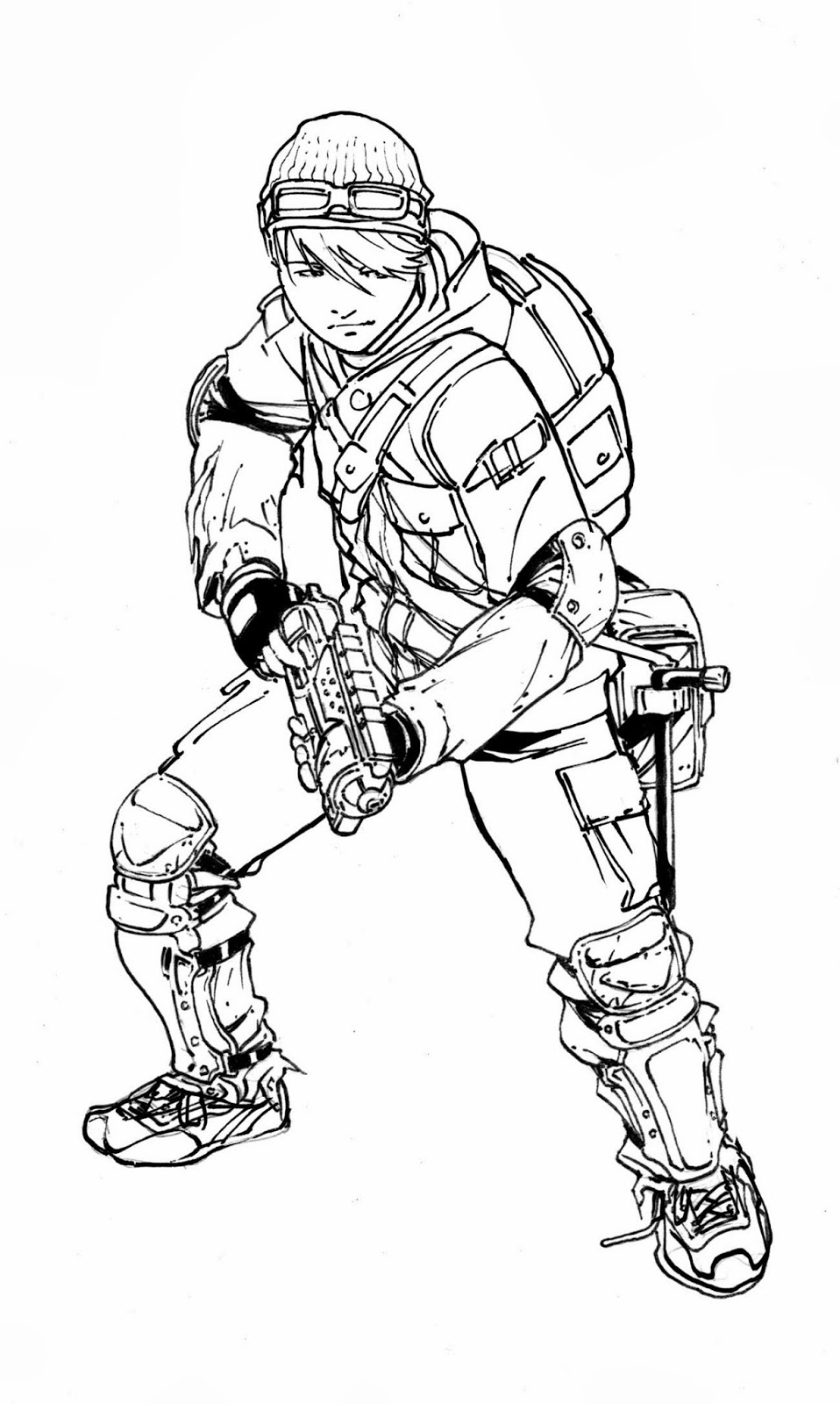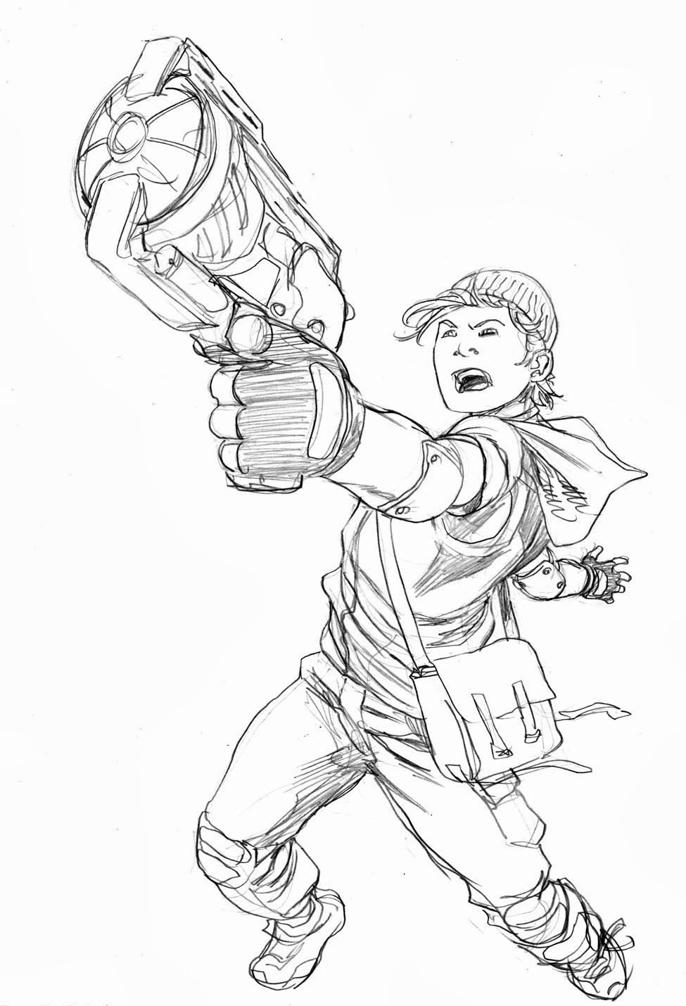 Here is the first kid I worked on. They wanted them to look like they were all dirty, and using sports gear as armor. The weapons would be the NERF guns and anything else they could get their hands on (i.e tire iron in the satchel). I don't normally do much coloring, but for these concept things it was quick work and a nice change of pace.