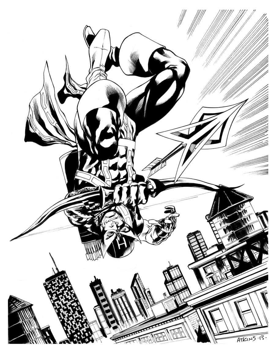 When I first started the sketch back at Heroes Con, I was drawing in Hawkeye in mid-flip as he was shooting the arrow. I hadn't really sketched it in that tight, but I knew I'd be drawing in buildings and such at the bottom. My wife is sitting next to me and when Shane comes by to check out the progress, my wife ask's why I accidentally drew the sketch upside down. AGGGH! So from then on, of course everyone thought I did this by mistake, that I just had the book turned the wrong way when I drew it. I tried telling them I did it on purpose, but sure enough, no one believed me. My loving wife...always there to help at the cons.