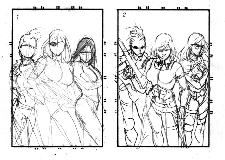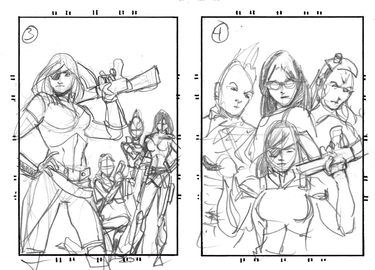 Of these 4 options they chose #3 to go with. The three in the background looking put out or annoyed at the new character grabbing the spotlight. I'll post the pencils tomorrow.