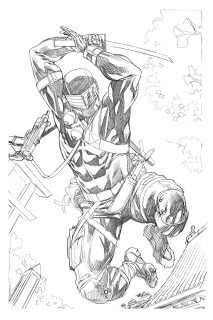 Here's the latest Snake Eyes Commission I'm working on, inks are mostly done. I'm sure my inking would go much quicker if I filled all the black shadows in with a brush instead of outlining them first. I hate smearing the ink when it hasn't dried yet, so I find by outlining everything, all the detail is taken care of, and then I can go in and fill in all the blacks from top to bottom and be done. Basically, it means I don't smear the ink as much or at all. But it's not very time efficient. If I was inking a regular book I certainly wouldn't do it this way.