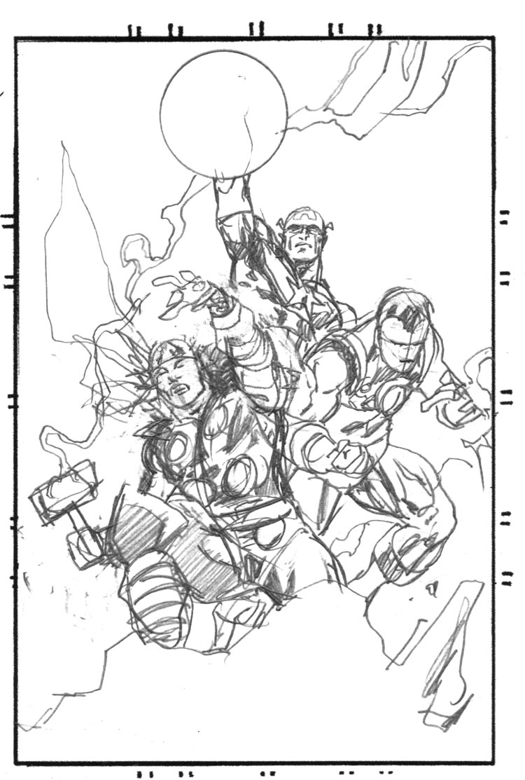 Here's the big three in the Avengers, more classic costumes. Finally got the inks done on this one.