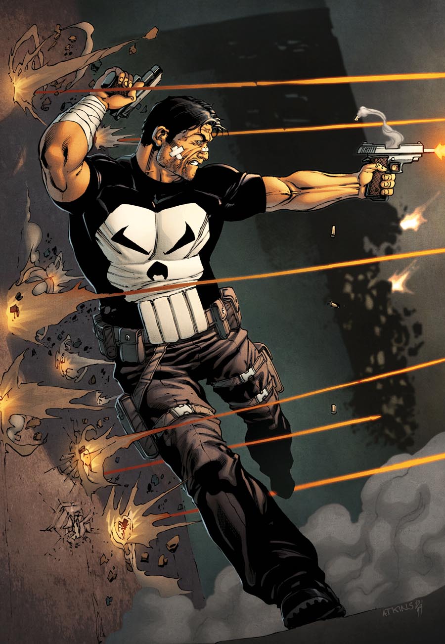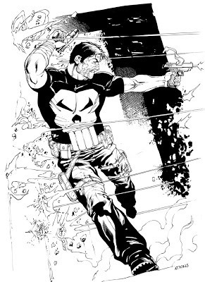 Here's a recent sketch I did again that Simon came in and did some great colors on. I love how he's able to really push the depth of the piece by blurring out the background, which bring the Punisher into a clearer focus and pushes him forward. Cool stuff.