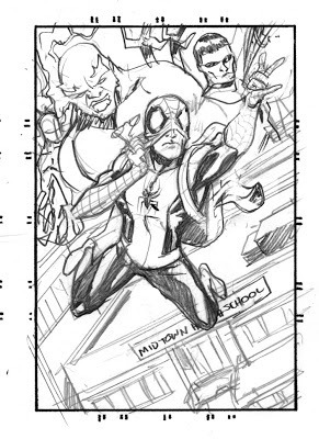 This is the "breakdown" stage. I basically take the layout I did at 3inches by 4 inches and enlarge it through a print out. I lightbox or trace off that layout onto the full size 11x17. You can see I made a few changes in spaces and added Sandman into the very background since I had more room at the top now.