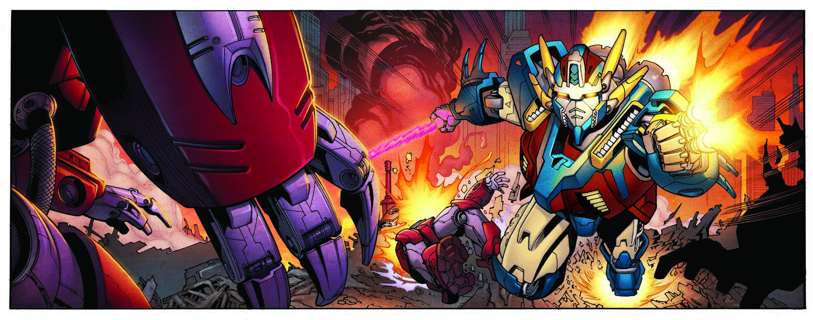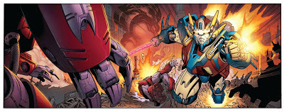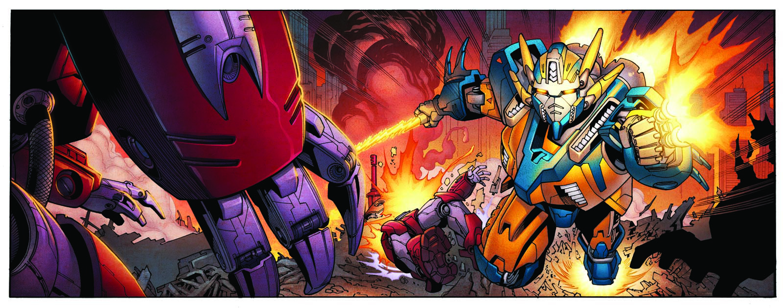 Colors here are by Simon Gough. I adjust his colors to get the second version. Mostly because I'm such a fan of Gundam mobile suits, that I wanted to see the mech that I drew have that traditional white base and read and blue accents. The orange and blue version that Simon did initially is the published version. My version is just a quick patch job to see for myself.
