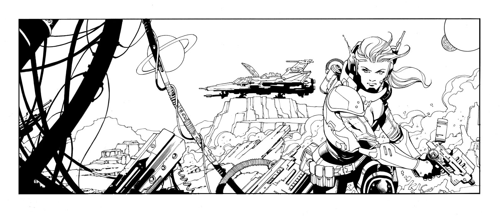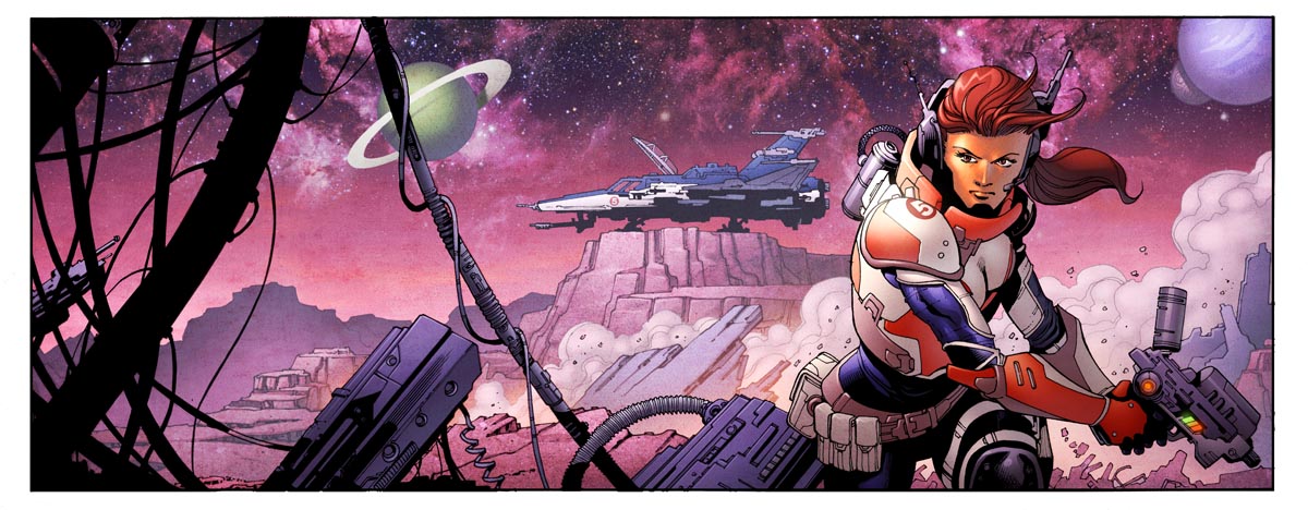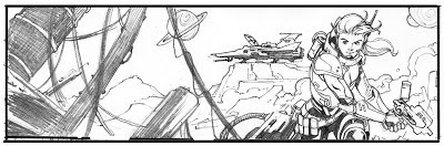 Here's the Sci Fi banner art for the new Comics Experience website. Colors by Simon Gough. I love that he put the number 5 on the character's armor and on the starship/fighter in the back. It's always been my favorite number, I was typically #5 on my soccer teams growing up and through college. I was the 5th kid in our family growing up. After seeing this I want to title the character "Five". As soon as I drew this I had so many ideas for stories involving the character. Hopefully I can do more with it down the road.