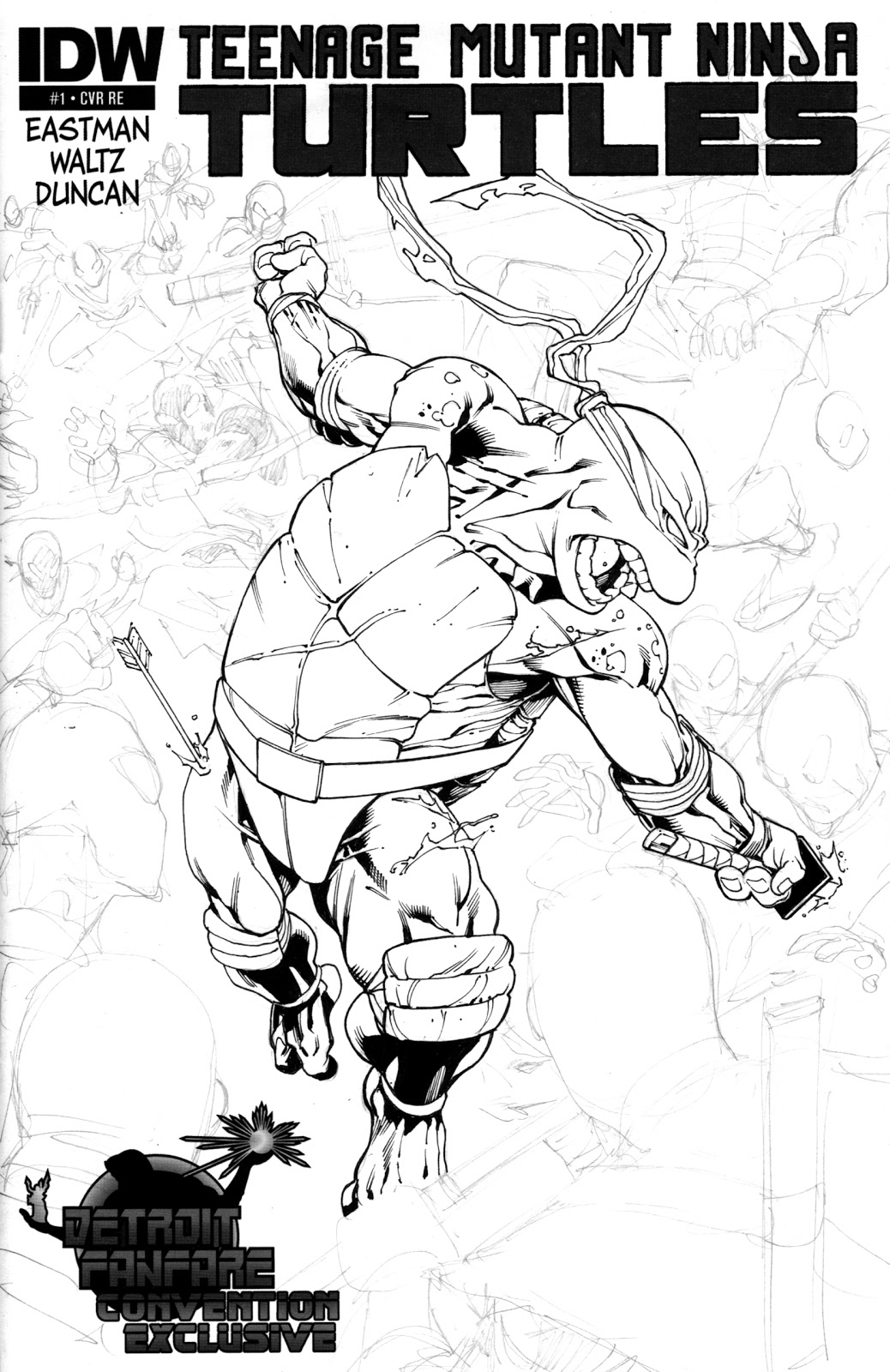 There's always an interesting anatomy challenge when drawing the Turtles. How humanoid to make them look in the anatomy? Some take it to extremes and go more toward the turtle direction. I've always approached it more that if you want them to really look like mutants, then you should push it more towards human anatomy. Just very stocky, and then the obvious differences in the hands, feet and head. But under the shell, These guys would follow basic human anatomy. That's what makes them so weird, and capable in their martial arts. It's their denseness and durability that makes them so tough to beat as well. Not to mention the obvious protection of their shells from rear and vital front attacks.
