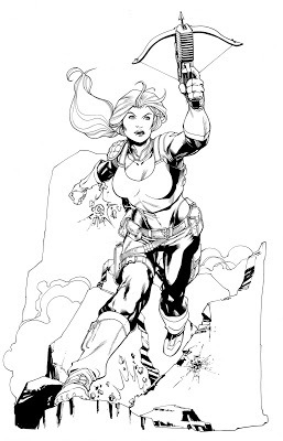 Here is another wonder color job done by Simon Gough over a Scarlett commission recently. I think with this sketch I really tried to capture movement and a dynamic female figure. I think torque-ing that front foot inward really helps sell the run for some reason. As always Simon did a great job with the atmosphere in particular.