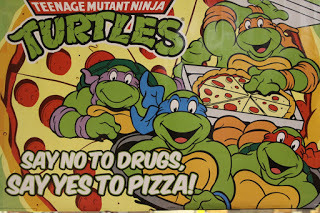 What I didn't think about was that this poster is actually a pretty positive message. You know, for the kids to stay of drugs and eat more pizza. So, according to how I drew this, in fact Donatello is so against this message he's ripping through the poster....apparently my version of the turtles are drug-running, pizza haters.