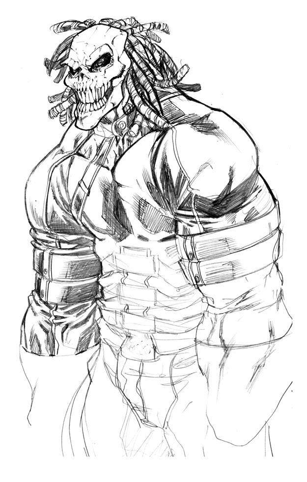 When it came to designing the character, Quinn described his skull like facemask and basically said make him as creepy as you can. Well, we all know how I'm not into creepy, so my first few attempts were considerably lame. Quinn gave me a bit of direction and I did another sketch or two narrowing it down. I set it aside for awhile and worked on other designs. Finally I sat down and did this quick sketch, without trying so hard or thinking about it too much. Sure enough, I nailed it as soon as I turned my brain off and just went to drawing. I then took that initial head sketch and worked out the rest of his body and outfit details. He's visually now one of my favorite reoccuring characters that the main kids have to deal with throughout RuneStone!