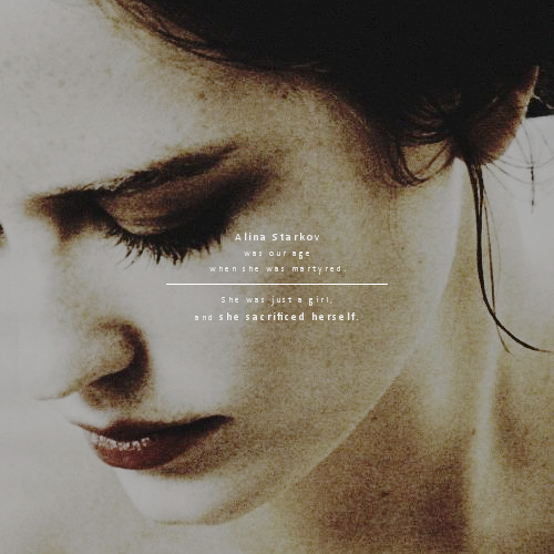 “Who decided Alina Starkov was a Saint anyway? She was a powerful Grisha. They’re not the same thing.” Alina Starkov was our age…