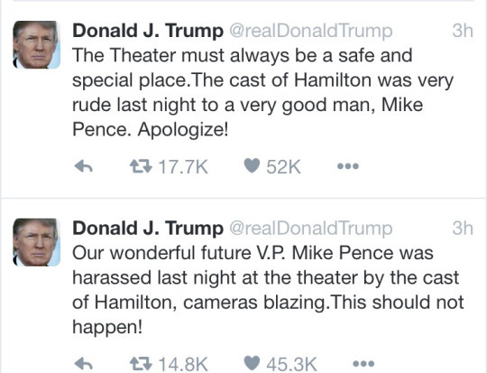 Mike Pence attended Hamilton and the cast had something to say to him: “We are the diverse America who are alarmed and anxious that your new administration will not protect us.” (x)