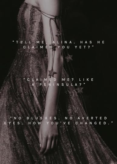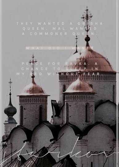 “They wanted a Grisha queen. Mal wanted a commoner queen. And what did I want? Peace for Ravka. A chance to sleep easy in my bed without fear. An end to the guilt and dread that I woke to every morning. There were old wants too, to be loved for who I was, not what I could do, to lie in a meadow with a boy’s arms around me and watch the wind move the clouds.”
