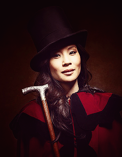 DO ANY OF YOUR REALIZE WHAT THIS IS, THIS IS LUCY LIU, DRESSED UP AS WATSON, SHE PLAYS A FEMALE JOHN WATSON, BUT SHE IS DRESSED IN A TOP HATTED 1800s JOHN WATSON, WITH A CANE, THAT SHE CAN PROBABLY BEAT YOU INTO SUBMISSION WITH,