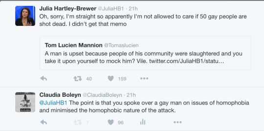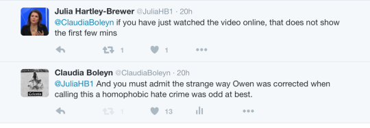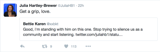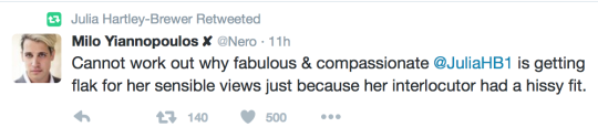 Unfortunately after giving these examples I got no further response, but Julia has since retweeted numerous foul tweets, one of which accuses Owen Jones of throwing a ‘hissy fit’ and one which tells an understandable upset and perfectly civil member of the LGBT community to ‘get a grip’.