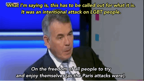 Mark: We are trying to draw parallels in terrorist attacks on people who are being attacked whether they are enjoying rock music in Paris, whether they are gay people in Florida enjoying a night out.
