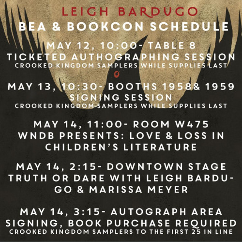 If you’re headed to Bookcon/BEA in Chicago, here’s where to find me. I’ll be giving away Crooked Kingdom chapter samplers (first FOUR chapters) aaaaaand some incredible SIX OF CROWS TATTOO SETS featuring the Dregs’ Crow and Cup by Kim Saigh and new designs by Fabrikator Queen @kayte-ghaffar. SEE. YOU. THERE.