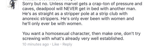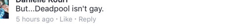 clearly stating his sexual attraction to men? Gets read as a joke, because that’s what it usually is. Deadpool kissing