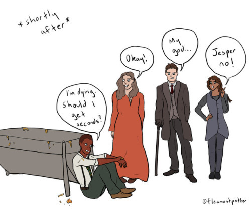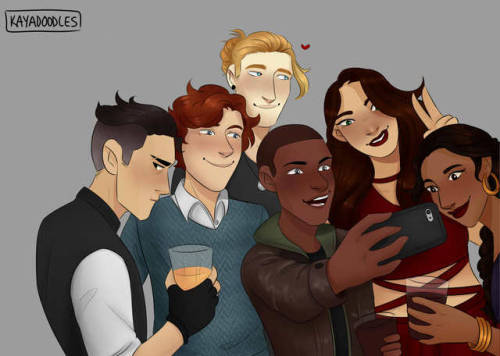 This is one of two drawings I made specifically to give to @lbardugo on her Language of Thorns tour (which was SO COOL). It’s the first time I’ve drawn the whole gang, and you can look forward to seeing more Modern AU crows in the future :)