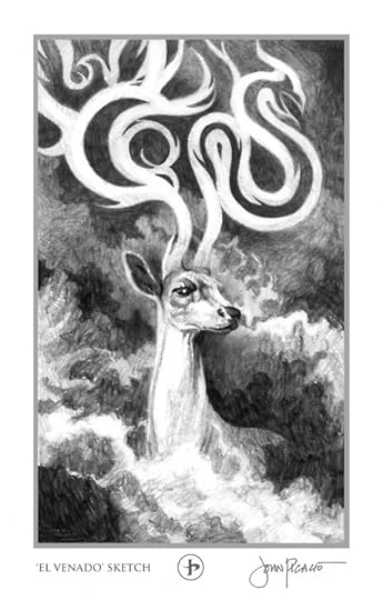 "El Venado" was inspired by Shadow and Bone, the first book in the Grisha Trilogy. (If you look closely, you’ll see the firebird, the sea whip, and the Darkling’s symbol.) The final version will be part of John’s Loteria series, and this beautiful sketch shows the first stage of the work’s development. This archival print is one of only two in the world (I own the other!), and you can win it. Here’s how: