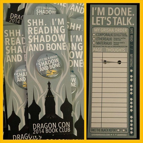 Front & back of #ShadowAndBone + #dragoncon2014 bookmarks and buttons designed by the brilliant @kayteghaffar. Book club is at 2pm today!