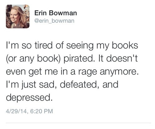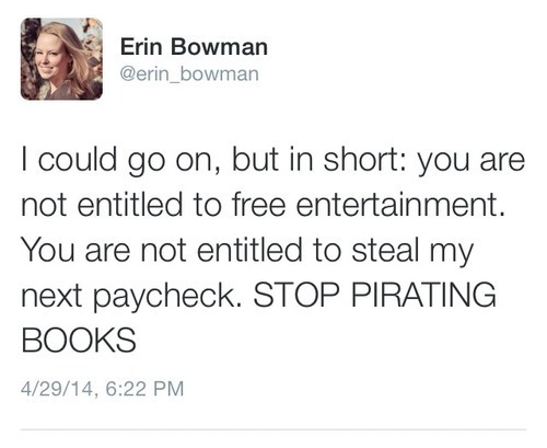 Okay, but if you’re an author and you’re that pissed off about pirated ebooks, do you get that angry about used books? Because you’re also not making any money off that, so why is that acceptable? I don’t see used book buyers getting called immoral, but they’re not contributing any money to the author, editor or publisher.