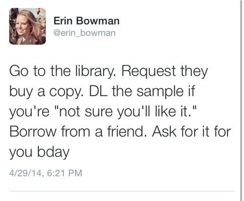 I was taking issue with the idea that people don’t have TIME to go to the library—I understand the scarcity of copies, depending on the branch, can be its own frustration—BUT to answer this, I’m sorry, but my answer to those who can’t 1. buy the copy legally in some form, or 2. go to the library, is to WAIT.