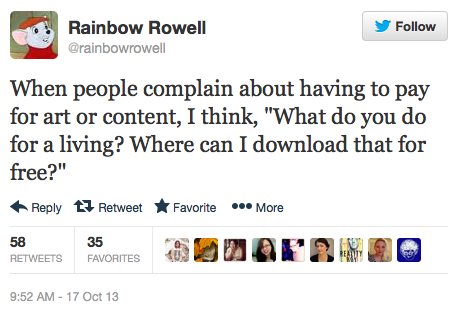In the last post I made, I was talking about the fact I’m writing a free novel-length story. (I try to write free extra stories a lot, though I haven’t written one on a novel-length scale before, and I feel very lucky I have time and energy and money, for now, to do so.) That is to say: there is free stuff available! Go, take it. I wrote it for you. I want you to. But I think it’s fair to say ‘With certain things I made, at certain times, I do really need to get paid by you/a library/someone who bought the copy new that you’re buying used/your friend who loaned you this/SOMEONE, so I can continue to eat and write stories both free and not-free.’ And it does not seem fair, to me, to say: ‘I want this specific thing you made, right now, for nothing, in exactly the way I want it, while harming you.’
