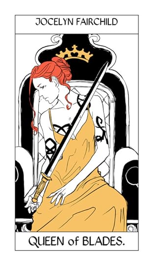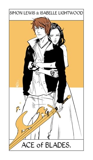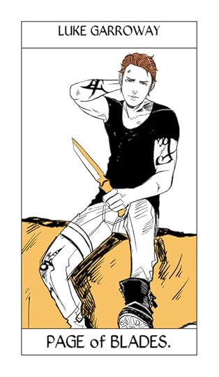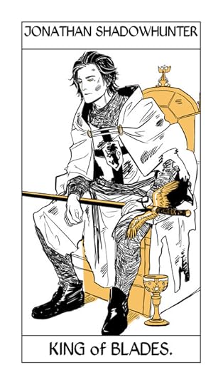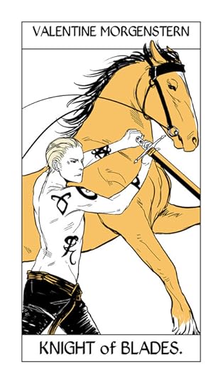 The last of the Swords arcana tarot cards from Cassandra Jean’s complete Shadowhunter Tarot. Simon and Isabelle as the Ace of Blades, Jocelyn as the Queen, Valentine the Knight (why is he riding a horse shirtless? Is that safe?) Luke as the Page of blades, and the one who started it all, Jonathan Shadowhunter, as the King.