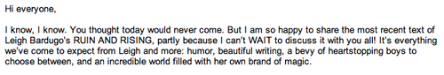 We just got this email from Leigh Bardugo’s editor. So of course we’re DROPPING EVERYTHING to read RUIN & RISING!